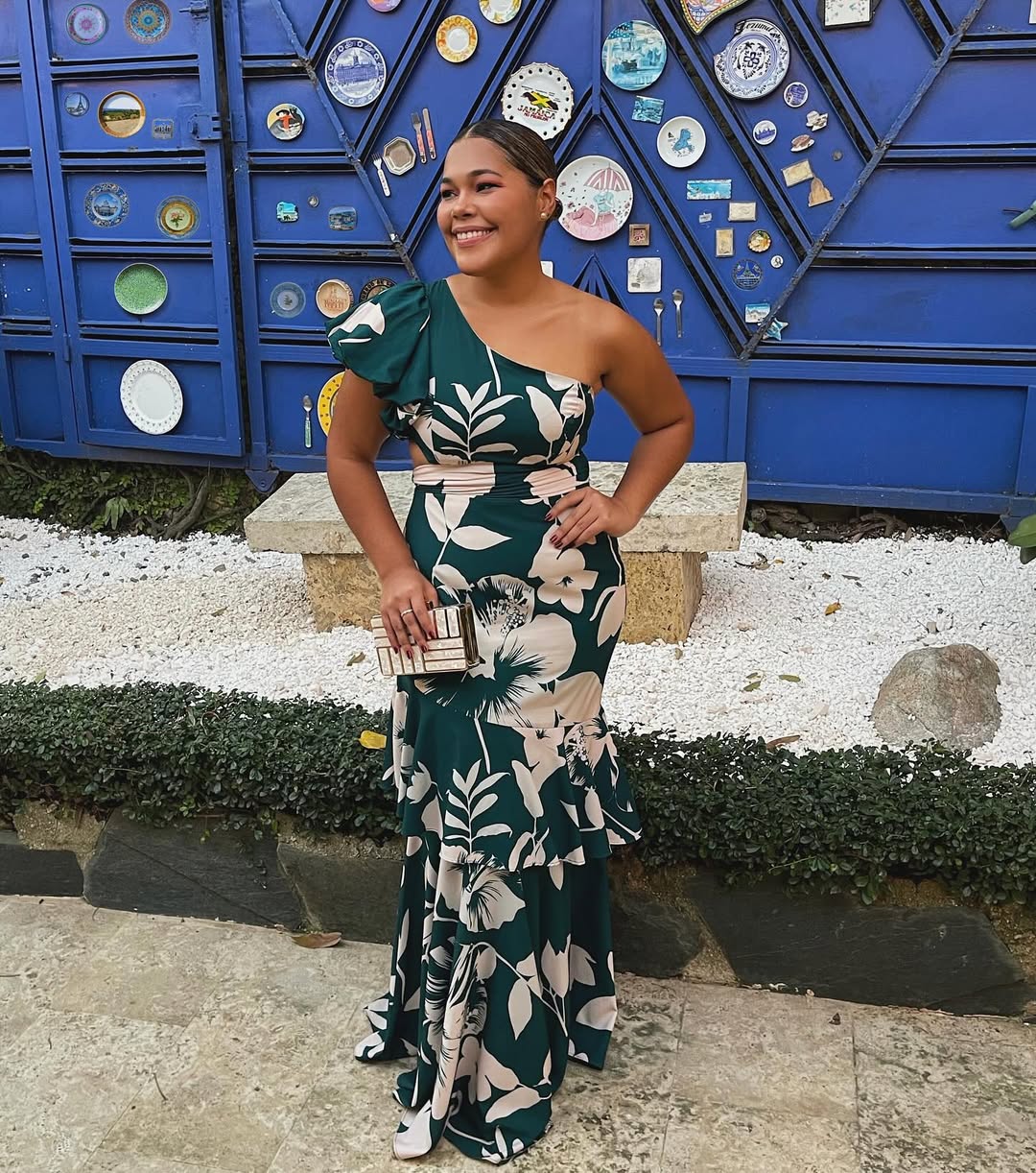 Vestido maxi floral un hombro y falda en capas