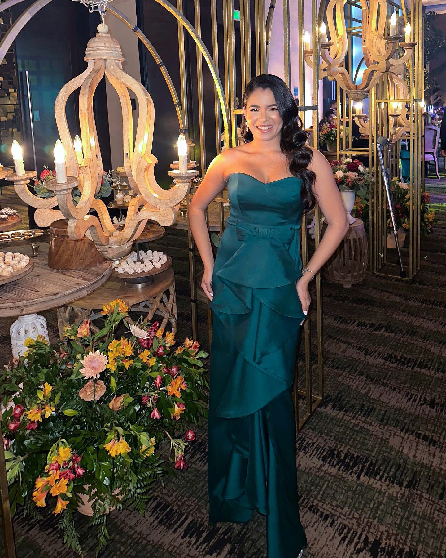 Vestido strapless con vuelos en la parte frontal de la falda