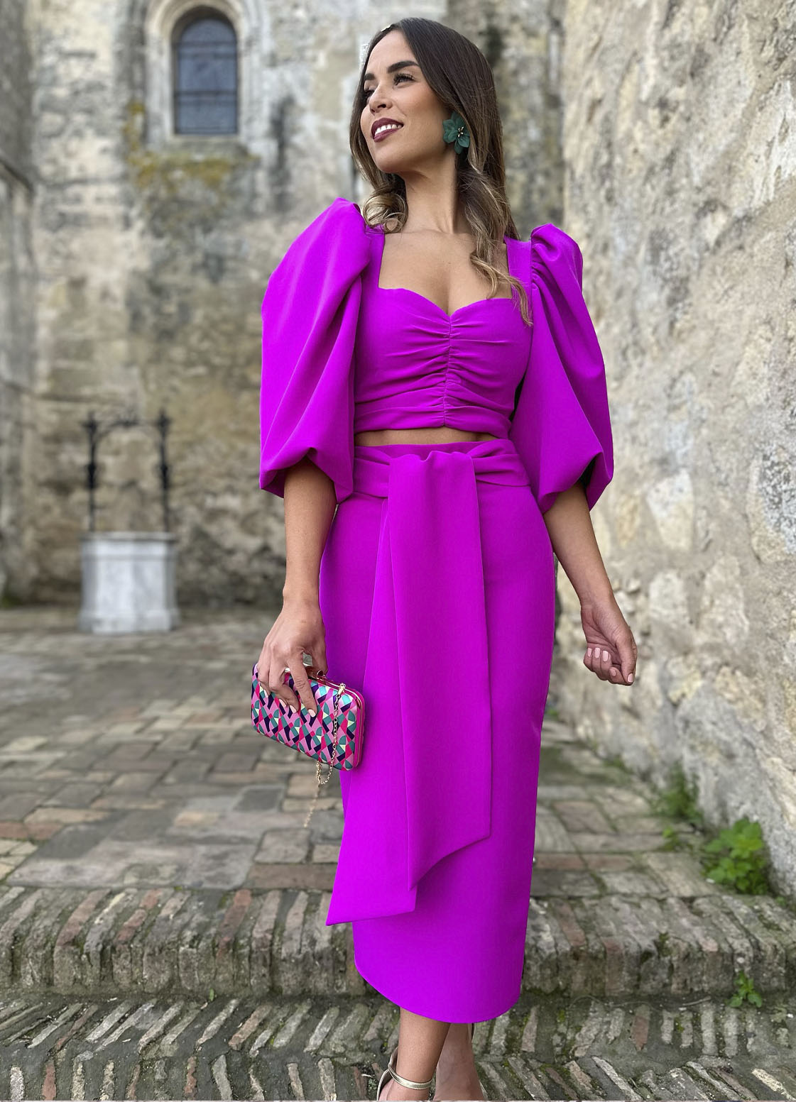 Conjunto de crop top con mangas 3/4 y falda midiÂ