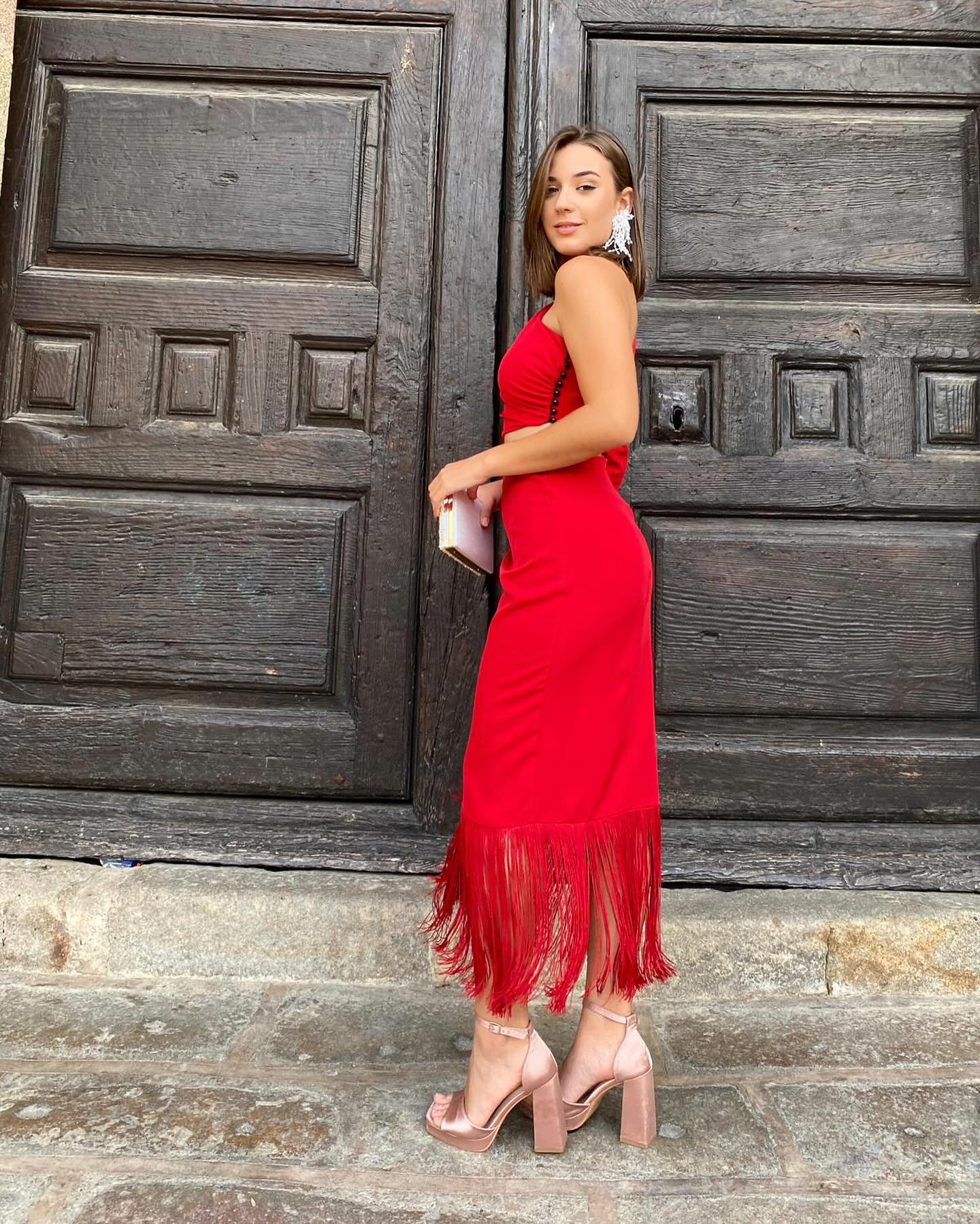 Vestido midi de flecos de un hombro y cutout en cintura