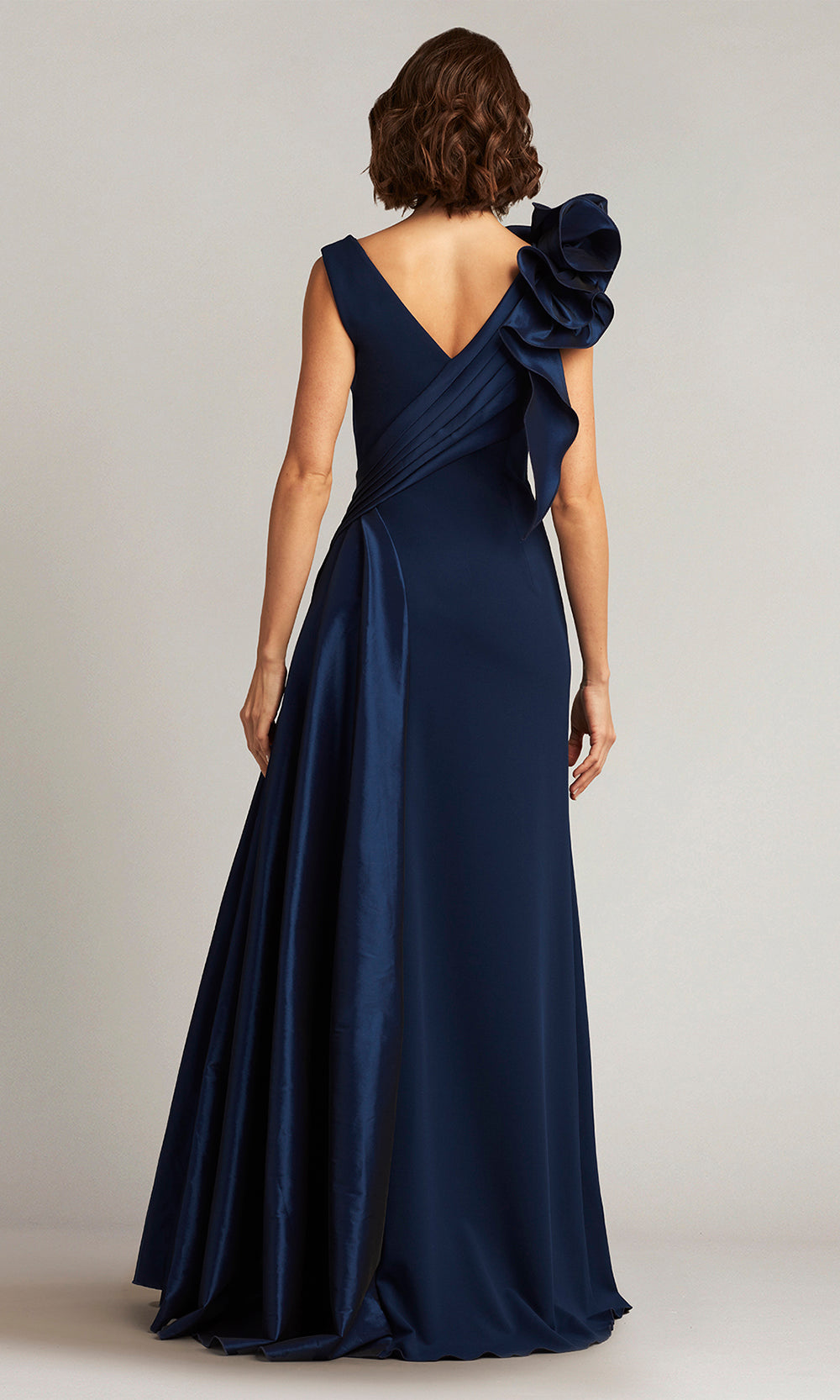 Vestido corte A con detalle de flor en relieve y cola en lateral