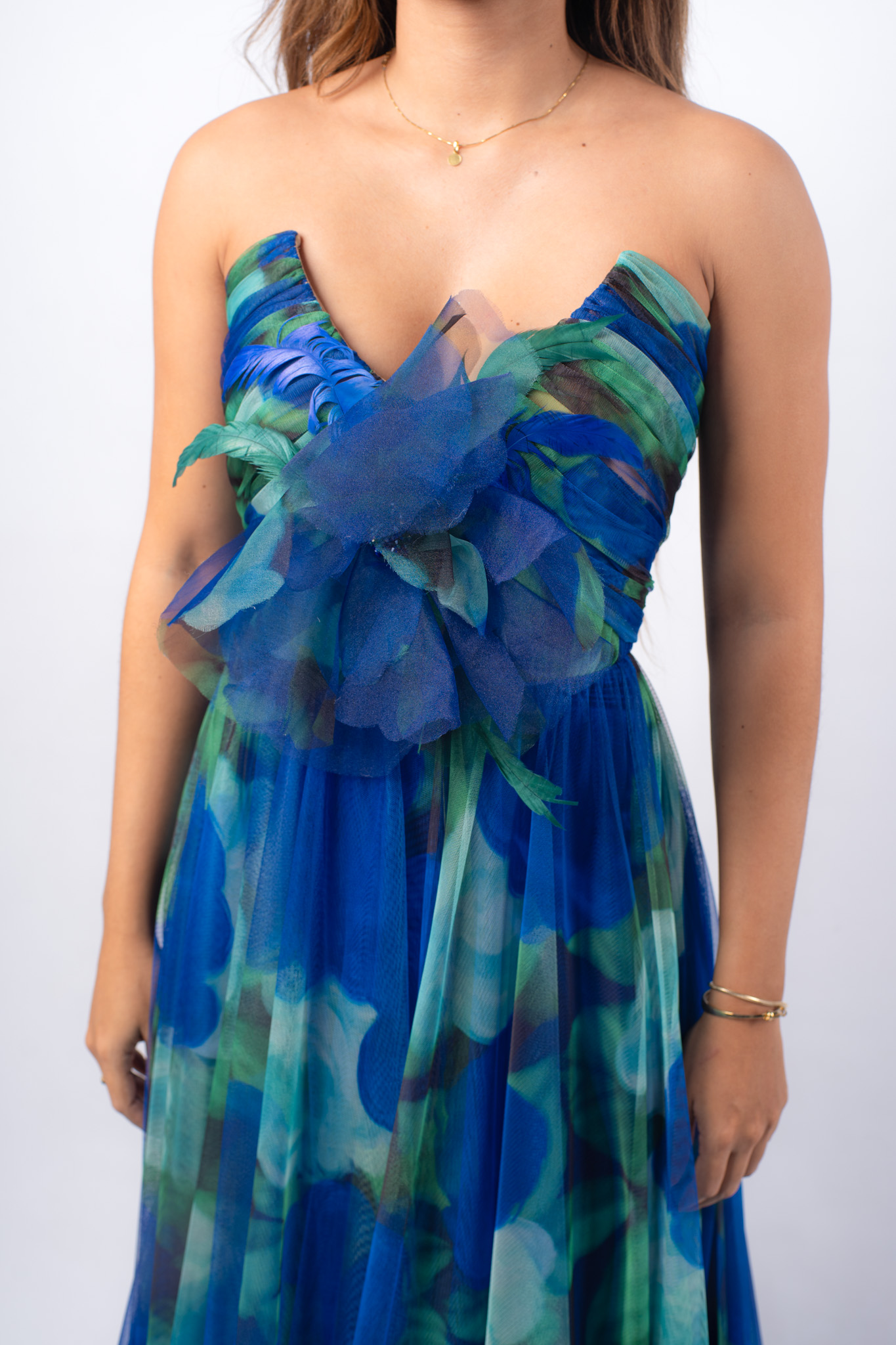 Vestido strapless con detalle de pedreria en el centro y plumas en relieve.