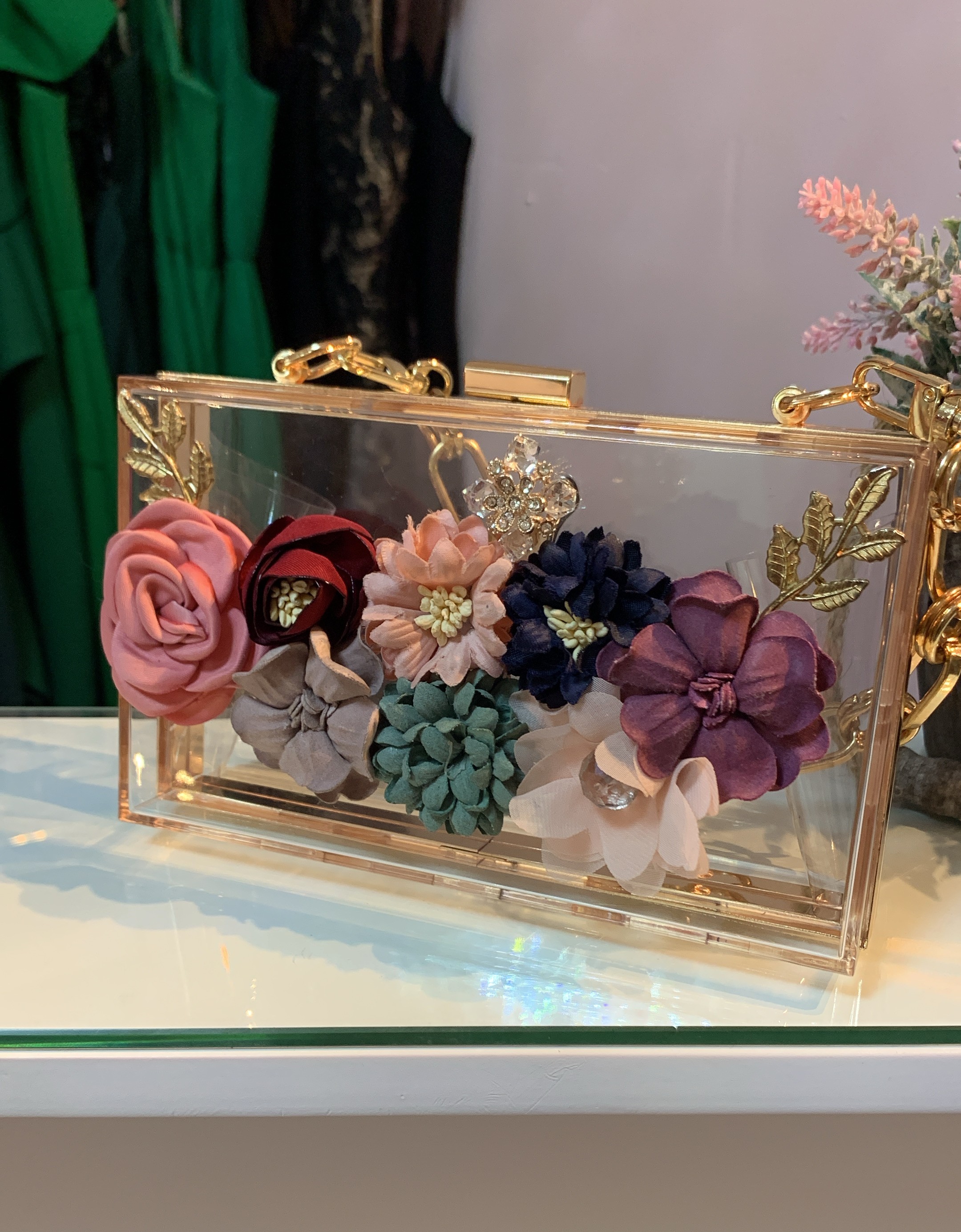 Sobre de mano acrílico con flores en relieve